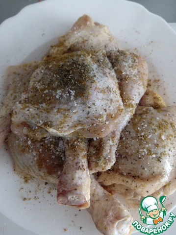 Части курицы (которые есть в наличии) приправляем солью, перцем (я, конечно же, не могу без хмели-сунели).