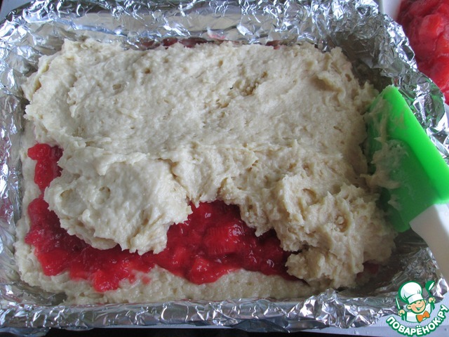 Выкладываем половину теста и хорошо разравниваем лопаткой. Наверх выкладываем половину начинки.