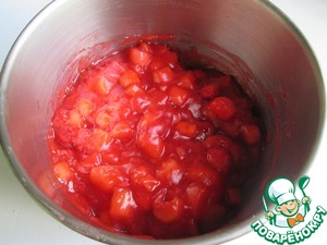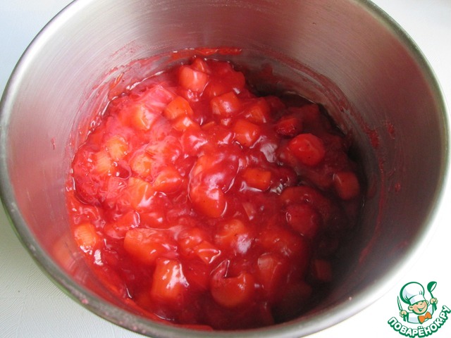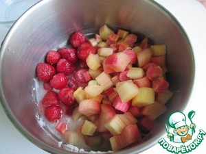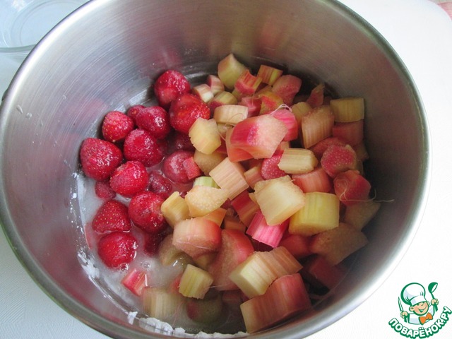 • Добавляем клубнику и кусочки ревеня. Всё хорошо перемешиваем и ставим на огонь.