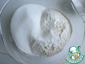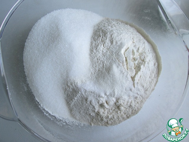 • В большую ёмкость просеиваем муку, разрыхлитель и соду. Добавляем сахар, ванильный сахар и щепотку соли. Всё хорошо перемешиваем.