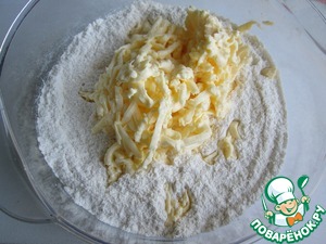 • В мучную смесь добавляем масло. Можно его нарезать на кубики и потом ножом порубить с мукой. Я воспользовалась тёркой.