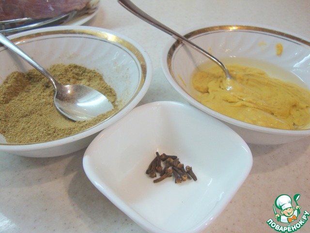 Обмазать мясо специями с горчицей, посолить.