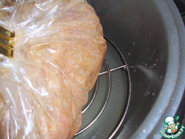 В чашу мультиварки положить подставку решетчатую для горячего. Налить 3 мультистакана воды.