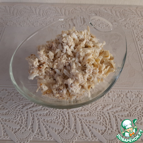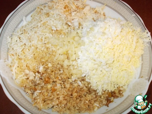 Теперь трем колбасный сыр, орехи и яйца на мелкой терке. Чеснок выдавливаем через пресс.