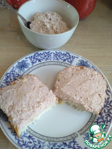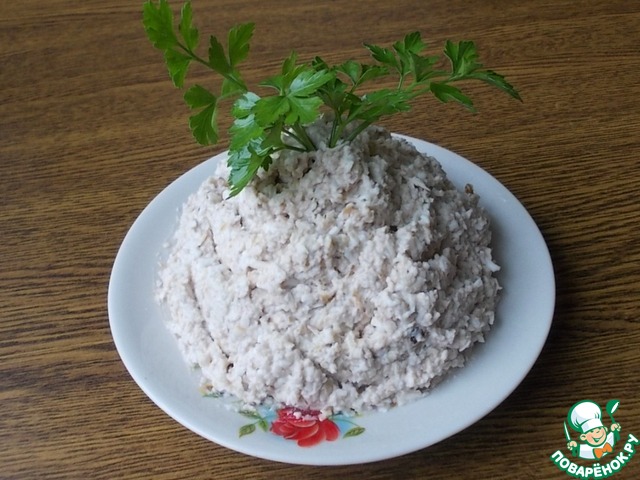 Готовый салат выкладываем на тарелку горкой. Конечно, можете положить его в пиалу или сразу намазать на ломтики хлеба, можно скатать из салата порционные шарики и обвалять их в мелко рубленной зелени, одним словом, как Вам будет удобно. Ну, и украшение блюда на Ваше усмотрение! Для нас достаточно не большой веточки петрушки!