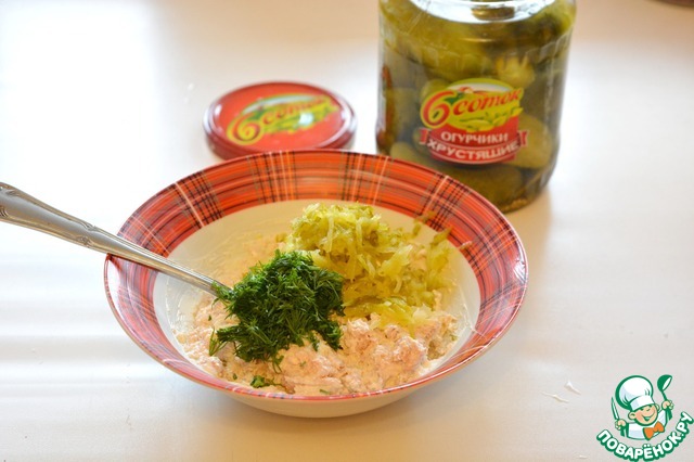 Небольшой маринованный огурчик натрите на мелкой тёрке, добавьте к соусу. Сюда же добавьте нарезанный укроп и измельченный чеснок и соль по вкусу