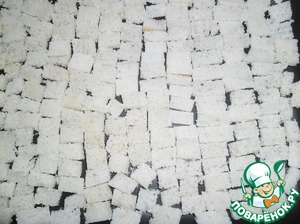 • Именно подсушим, т. к. нам надо белые сухарики, которые держат форму. Оставшиеся обрезки так же просушим в духовке, они нам пригодятся.