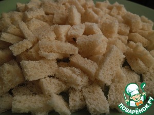 • С батона срезаем корочки, нарежем на тонкие полоски, подсушим в духовке,