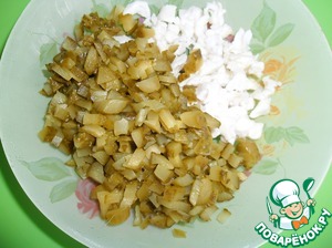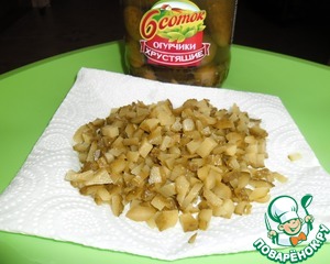• Огурчики нарезаем мелко, обсушим. Огурчики ТМ 6 СОТОК такие крепкие, что их не надо откидывать на дуршлаг, а достаточно выложить на бумажное полотенце.
