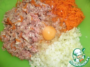 • Тыкву натереть на тёрке "крупная чешуйка", лук порубить и соединить с фаршем. Добавить 1 яйцо, соль и перец по вкусу. Всё тщательно перемешать, отбить, я делаю это прямо в миске.