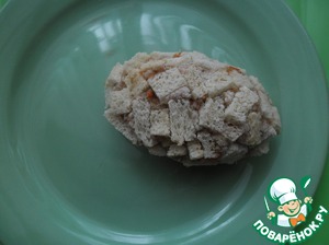 • Окунуть в льезон, обвалять в муке, в сухарики. Сухариками покрыть всю поверхность зразы, обминая их в ладонях, крепко прижав. Для тех кому это сложно, есть второй вариант. Те кусочки батона, что остались после нарезки сухариков, мы с вами высушили, теперь остывшие высыпать в полиэтиленовый пакет, растолочь на столе скалкой, выложить в дуршлаг, просеять, использовать то, что осталось в дуршлаге. Именно крупные кусочки пойдут на второй вариант панировки.