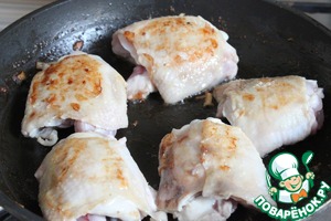 В этой же сковороде обжариваю на сильном огне куриные бедра (до румяной корочки, около 5 минут).