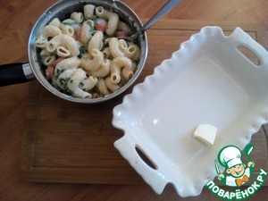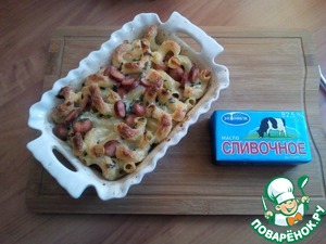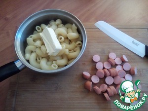 Щедро мажем макароны сливочным маслом. Сосиски режем.