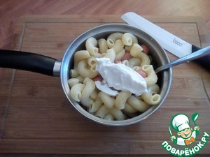 Отправляем сосиски, сыр мягкий к макаронам и тщательно всё перемешиваем.