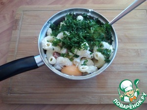 Макароны немного остынут и разбиваем в них яйца, добавляем петрушку и перемешиваем. Можно досолить по вкусу. Я больше не солила.