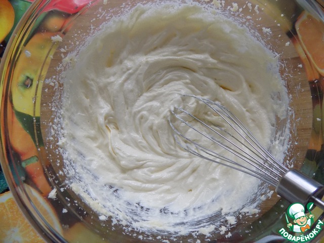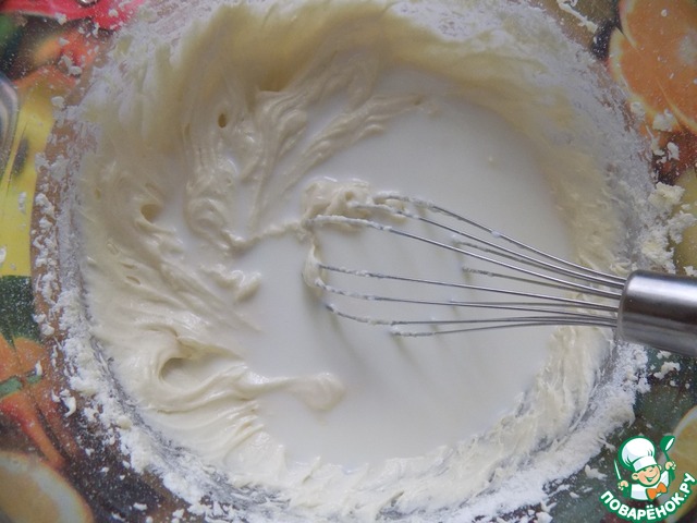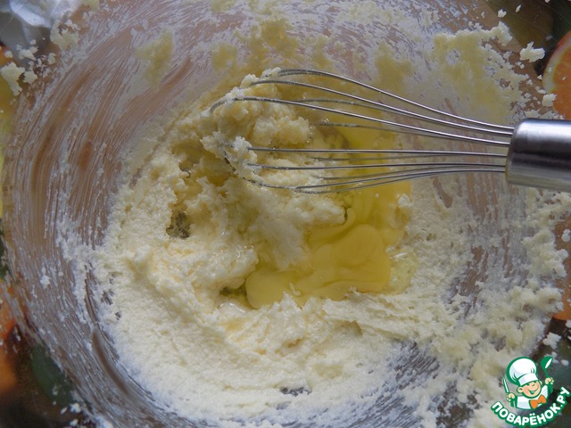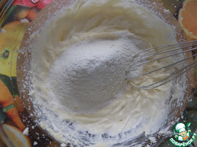Муку (просеянную)смешиваем с разрыхлителем, половину смеси добавляем в яично-масляную массу, перемешиваем на низких оборотах миксера.