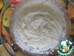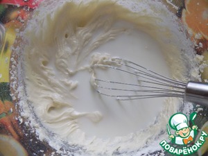 Крем можно приготовить любой по вашему вкусу, главное, чтобы он хорошо держал форму. Я готовила швейцарскую меренгу, делается она очень просто. Белки нужно смешать с сахаром (120 г), поместить в достаточно большую жаропрочную емкость и поставить на водяную баню (дно посуды с белками не должно касаться воды, воду нагреваем на среднем огне). Взбиваем миксером на самой низкой скорости 8-10 мин., снимаем с бани и продолжаем взбивать до остывания и загустения массы. Крем должен получиться пышным и плотным. У меня в самом начале взбивания сломался миксер. Я решила не останавливаться на полпути и попробовала взбить вручную. Взбивала минут 15. Крем, конечно, не получился таким пышным, как хотелось, но прилично загустел и довольно хорошо держал форму.