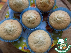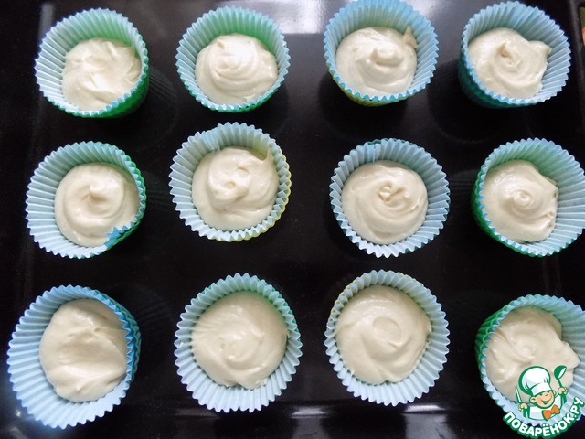Раскладываем тесто по формочкам, примерно по одной столовой ложке с горкой, но это зависит от размера формочек (у меня получилось 12 шт.)