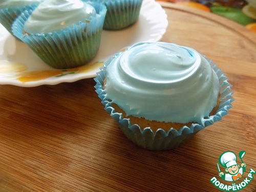 Делим крем на 2 части, одну окрашиваем в голубой цвет (у меня краситель гелевый). Голубым кремом покрываем всю поверхность капкейка.