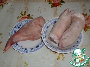 Подготавливаем продукты. Сегодня готовим холодец из свиных ножек и кролика. Свиные ножки очень хорошо промываем горячей водой.