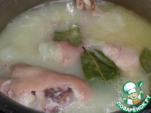 В кастрюлю кладем свиные ножки и ножку кролика. Добавляем 2 литра воды. Доводим до кипения. Убираем пенку.