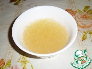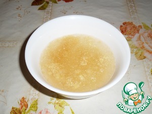 Набухший желатин подогреваем в микроволновой печи на максимальной мощности 1 минуту, предварительно накрыв чашку.