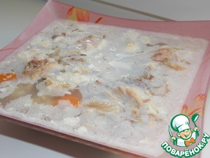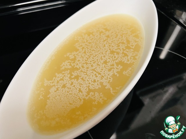 Заливаем бульоном. После того, как содержимое тарелок остынет до комнатной температуры, убираем на ночь в холодильник.