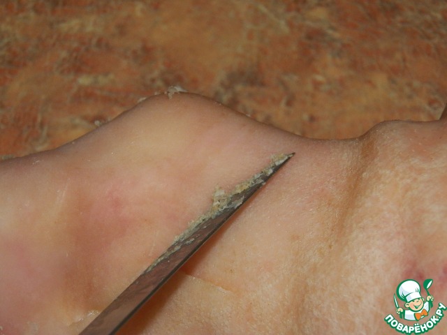 Достаем рульку и проводим ей "пилинг" - ножом соскабливаем с нее верхний слой клеток кожи, грязь и проч.