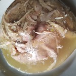 Вылавливаем мясо - вилкой и ножом/руками разделяем на волокна и раскладываем по тарелкам/лоткам. Лук, перец, лавровый лист - в мусор. Морковь разрезаем произвольно и также раскладываем по тарелкам. Сверху выдавливаем по два зубчика чеснока на тарелку.