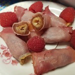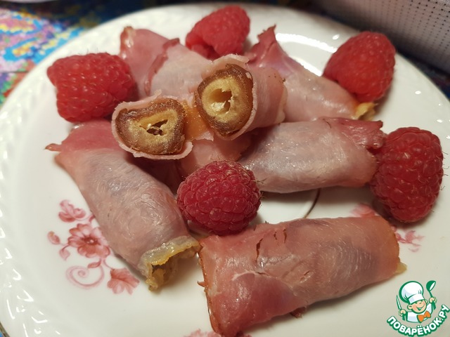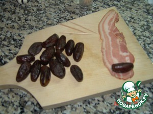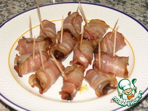 Каждый финик заворачиваем в полосочку бекона, скрепляем зубочисткой, укладываем на противень. Когда все финики завернуты, то, по желанию, сверху на канапе можно нанести несколько капелек мёда. Ставим в духовку на 5, максимум 10 минут.