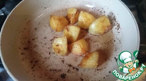 Когда картошка сварилась, заливаем ее холодной водой, снимаем шкурку, режем на четвертинки и обжариваем на сковороде со сливочным маслом до румяной корочки.