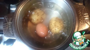 Через минут 5-6 достаем яйцо из кипятка, чистим, режем и добавляем к салату.