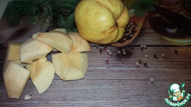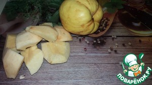 Айву помыть, почистить, разрезать на 4 дольки, а затем каждую дольку поперек.