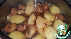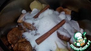 Добавляем сахар и корицу. Наливаем горячую воду, ставим на средний огонь, с закрытой крышкой варим 20 мин.