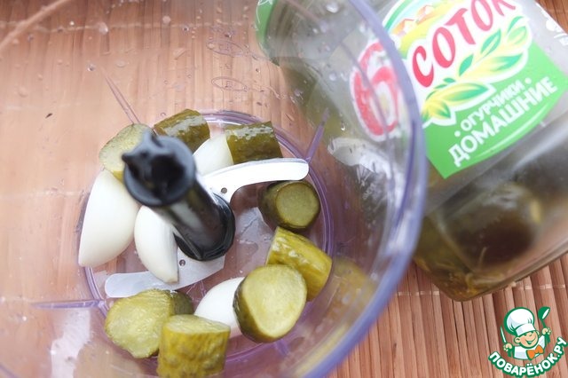 В блендере измельчаем лук и маринованные огурцы. -