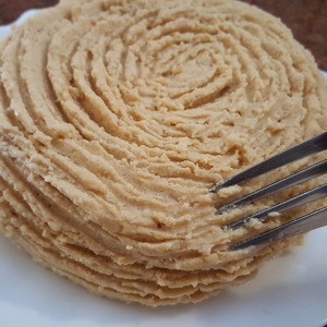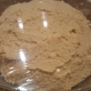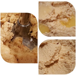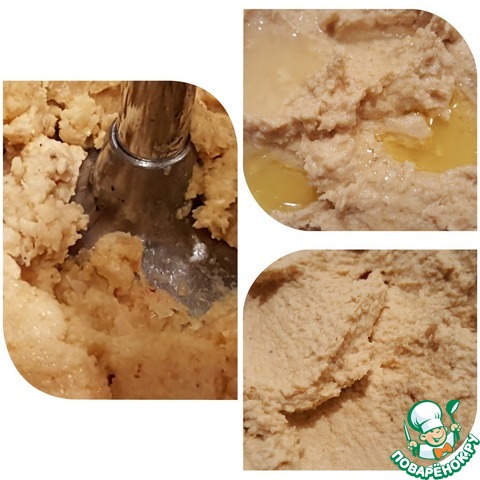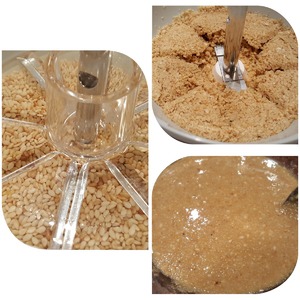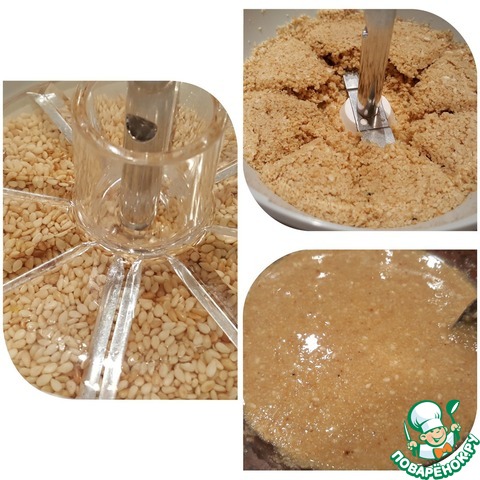 Жареный кунжут измельчаем в кофемолке или в специальном измельчителе до мелкой крошки. Добавляем ложку оливкового масла и взбиваем. Таким образом мы получаем тахину. Так как для приготовления хумуса мы будем использовать погружной блендер, я решила упростить задачу и просто смешала кунжутную крошку с оливковым маслом без взбивания.