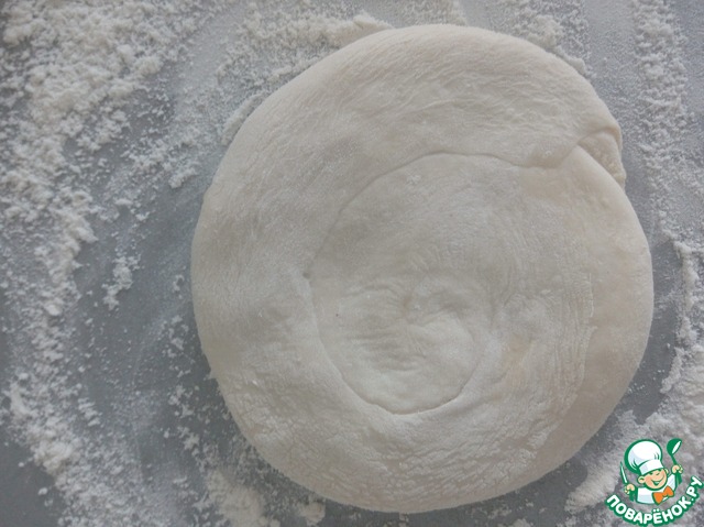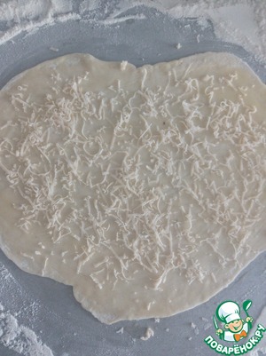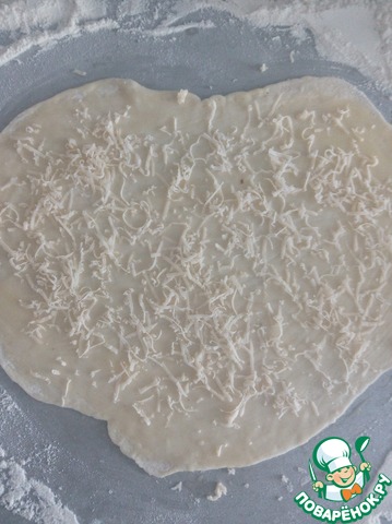 Замесила тесто и убрала в холодильник.утром отрезала кусочек теста (делала я пол нормы) раскатала смазала маслом только сливочным, про растительное я забыла в попыхах.сыр.скрутили улитку, в холодильник не убирала второй раз. Просто некогда было. И сразу стала жарить.