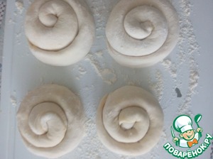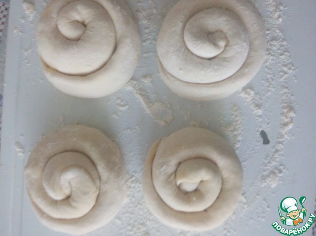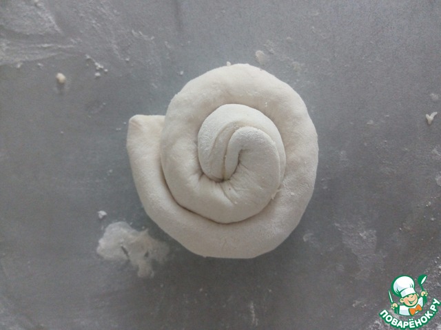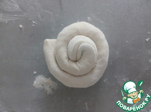 Сворачиваем тесто в рулет, а затем формуем улитку. Так же делаем с остальными кусочками.