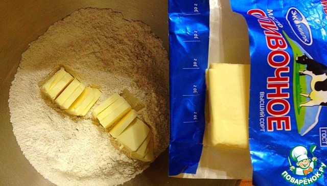 Смешать оба вида муки с разрыхлителем. Добавить холодное масло от Экомилк. Перетереть в крошку.