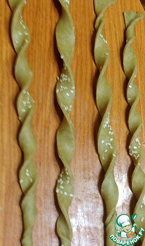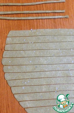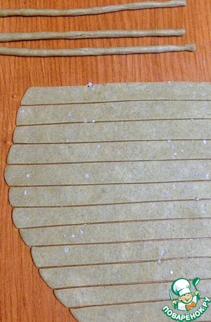 Разделить тесто на две части. Одну часть раскатать тонко и посыпать крупной солью. Прокатать скалкой, чтобы соль вдавилась в тесто. Нарезать полосочками, шириной около сантиметра. Затем скатать жгутики.