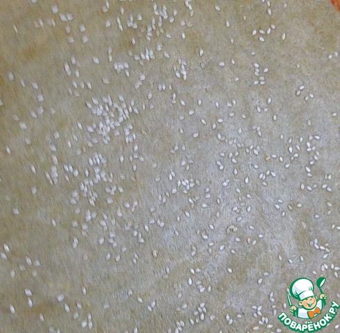 Вторую часть теста так же раскатать тонко и посыпать кунжутом. Сверху пройтись скалкой.