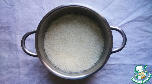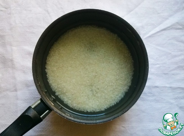 Помещаем рис в кастрюлю, заливаем водой. Воды должно получиться на 1/5 больше, чем риса, т. е. из всего занимаемого рисом с водой объема в кастрюле 4/5 - рис, 1/5 вода, а сама кастрюля должна быть заполнена рисом и водой на 1/3 от своего объема. Это просто информация для справки, не пугайтесь))) Если придерживаться количества указанных ингредиентов, так оно и получается, не стоит по этому поводу напрягаться и замерять все линейкой)))