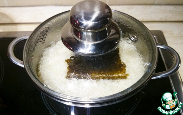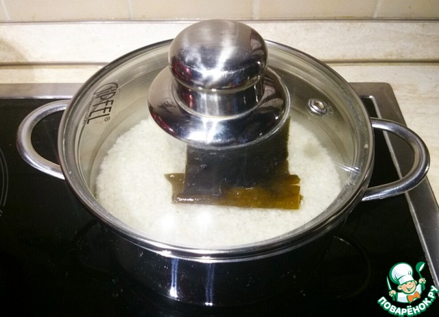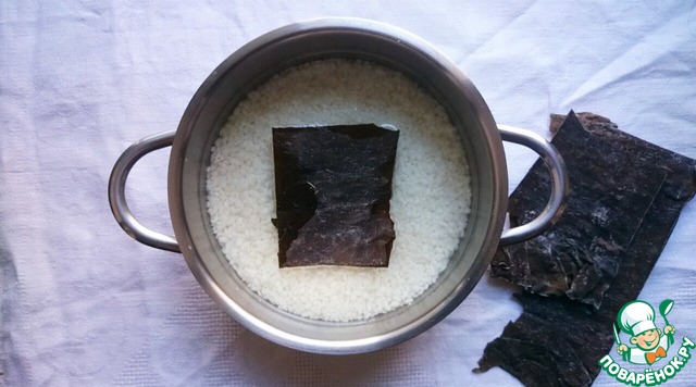 Для того, чтобы вкус и аромат риса соответствовал суши и роллам, подаваемым в кафе и ресторанах, кладу прямо на рис кусочек водоросли комбу. Если вдруг будет интересно, где ее можно приобрести, спрашивайте, помогу, чем смогу, или просто вбейте в поисковик, он точно подскажет. Ее можно сразу купить упаковку, стоит не дорого, она сушеная, хранится долго и хватит тоже надолго. Водоросль комбу просто не так популярна, как нори, не все о ней знают, что выгодно заведениям, сами понимаете.