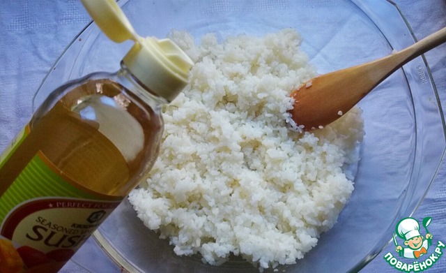 За это время можно подготовить заправку. Она состоит из рисового уксуса, сахара и соли. Раньше рисовый уксус покупала в чистом виде, без добавок, и сама добавляла в него сахар и соль в нужных пропорциях. Для лучшего и скорейшего их растворения уксус лучше немного подогреть, но не кипятить. Теперь же в продаже есть рисовый уксус, в котором уже все добавлено, поэтому мне нужно только заранее достать его из холодильника, чтобы он был комнатной температуры, не холодный. Рис спустя указанное время выкладываем в форму ровным слоем (у меня, увы, не дерево, как положено, а стекло, но ничего дурного в этом не вижу) и поливаем заправкой.