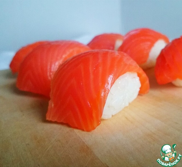 На рис кладем кусочек рыбы, вес тоже около 20-25 гр - и все! Рис не распадется ни после сдавливания (разумного) палочками ни после опускания в соевый соус! И никаких водорослей нори, которые не всем нравятся - только рис и рыба! Очень вкусно!