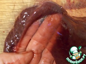Теперь нам надо ее правильно обработать. В первую очередь нужно удалить пленку, которая покрывает ее. Именно она горчит и из-за нее куски съеживаются при тепловой обработке. Обычно она прекрасно удаляется при помощи пальцев, подцепив и тихонько потянув. Но если не получается, то облейте ее горячей (не кипятком) водой и потом она обычно отходит без проблем. Так же надо удалить все жилы и сосуды. Извиняюсь за фото, но по другому не получилось ее показать.