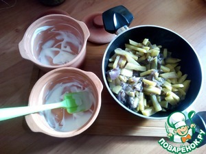 Готовим горшки. Я взяла 2 горшка, по величине они на одну порцию большеватые. Обмазала внутри горшки сметаной.