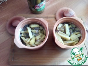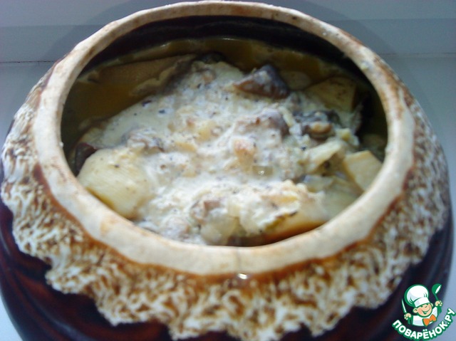 Добавила по пол-поварёшки грибного бульона в каждый горшок и верх залила сметаной. Поставила в духовку на 1 час при т-180 С. Минут через 15, когда в горшках начало кипеть, убавила температуру до 150 С.