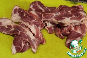 Мясо без жил, костей и лишнего жира режем на порционные куски 1-1,5 см шириной. Идеально - шейка.