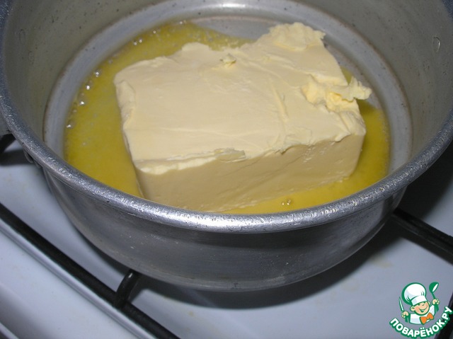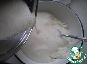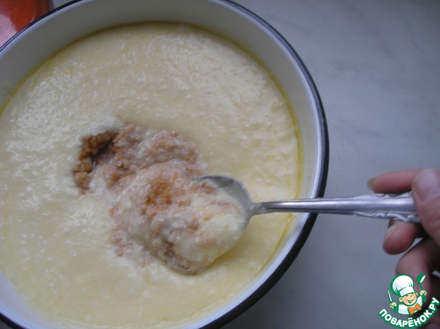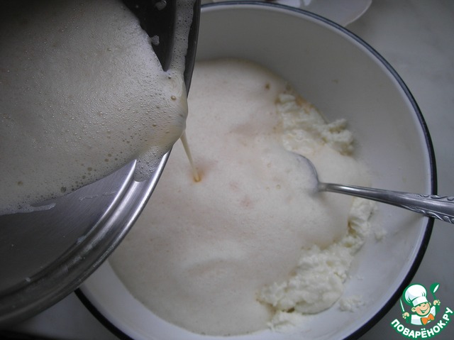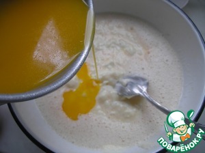 Пришла очередь добавить уже не горячий, но ещё тёплый маргарин к общей творожно-яичной массе. Лучше лить тоненькой струйкой и аккуратно перемешивать.